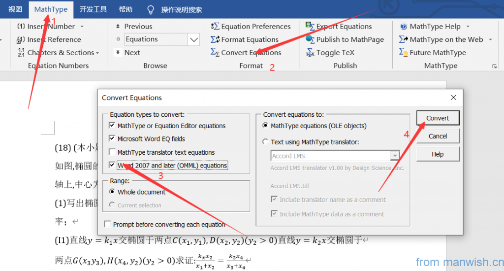 点击菜单->Mathtype->Format->Convert Equations->勾选word 2007 and later(OMML) equations->Convert稍等片刻即可